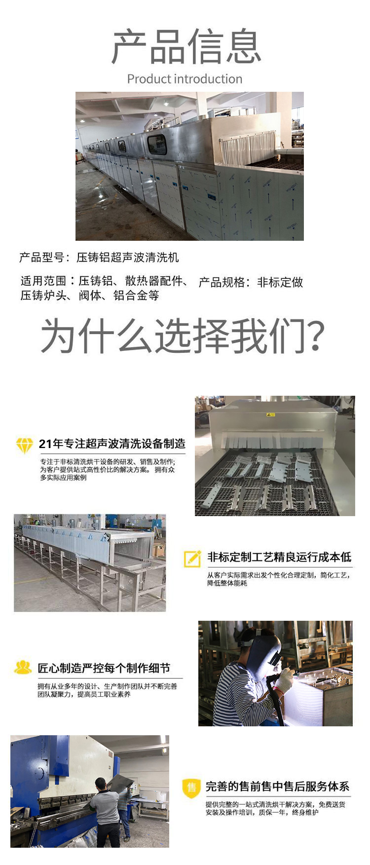 鋁合金壓鑄件超聲波清洗機是一臺履帶式超聲波清洗烘干線,采用特制網(wǎng)鏈傳動輸送工件,具賄超聲波粗洗、超聲波精洗、鼓泡過水、切水、烘干、等功能的連續(xù)式清洗烘干設(shè)備。只需要人工將工件放在特制的傳動網(wǎng)鏈上,工作時,清洗工件置于輸送帶上,依次通過清洗室、清洗室、漂洗室、切水室、烘干室完成清洗、漂洗、過水、吹水、烘干等流程后出料,超聲波槽回液經(jīng)過濾處理循環(huán)使用,鋁合金壓鑄件超聲波清洗機具有工位多,功能全,結(jié)構(gòu)合理,操作方便,清洗效果好的優(yōu)點,這對于流水線零件的清洗,改善勞動環(huán)境,節(jié)省勞動力,提高清洗和吹干質(zhì)量,具有重要的意義。